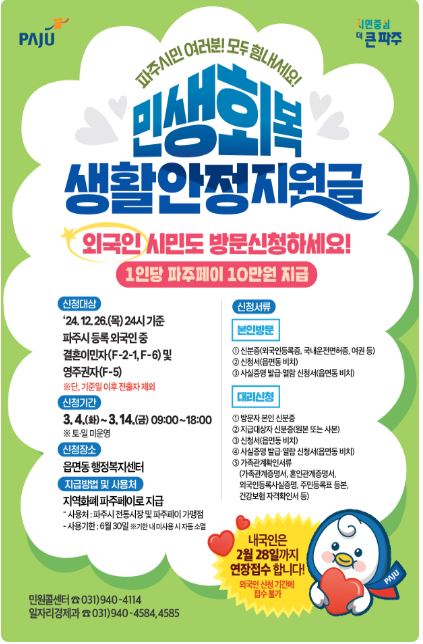 - 지급 대상: 2024년 12월 26일 기준으로 파주시에 체류 등록된 결혼이민자(F-2-1, F-6)와 영주권자(F-5)